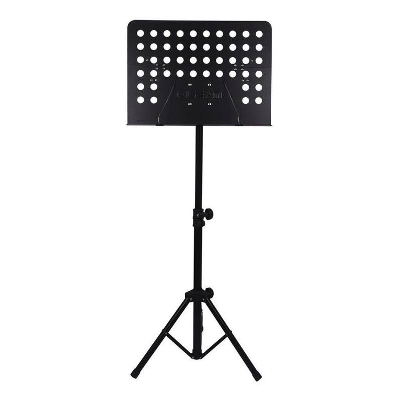 Atril de director de lujo para partituras, sistema plegable para mayor facilidad en su transporte. construcción metálica robusta y peso liviano. 3 Cuerpos. Acabado Negro. Altura regulable entre 80 a 150 cm. Bandeja angular de 0 a 90 grados. Excelente apariencia y resistencia. Desempeño profesional.