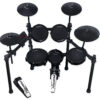 El Carlsbro Club100 es una batería electrónica compacta de 5 pads y 2 pedales. Incluye un pad de caja, dos pads de tom, un pad de plato, un pad de plato Hi-Hat con pedal controlador y un pedal de bombo. Este kit simplificado es perfecto para bateristas jóvenes y principiantes, pero también para bateristas que buscan ahorrar espacio en el estudio o usarlo como ayuda para practicar, ya que es muy compacto y fácil de transportar.
