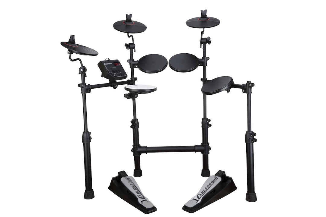 La batería electrónica Carlsbro CSD100 de 7 piezas incluye el módulo de sonido Commander 100, 4 pads de batería de 7″, 3 pads de platillo de 8″, 2 pedales para simulación de bombo y charles, un marco telescópico con altura totalmente ajustable y un par de baquetas Carlsbro.