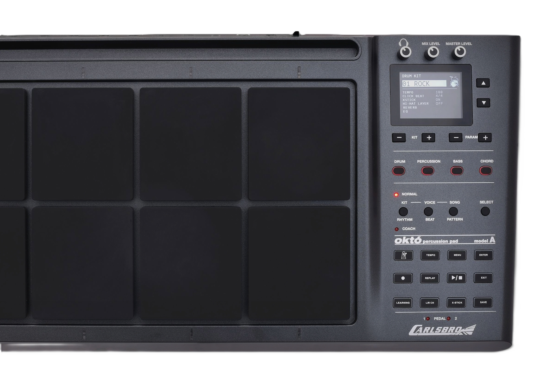 El set de pads de percusión Okto A incluye 8 pads de goma de alta respuesta, resistentes y configurables por el usuario. 2 pedales de conmutación para controlar el bombo y el hi-hat. 408 voces de batería, 30 kits de batería predefinidos y 20 kits de batería de usuario. Funciones de grabación, reproducción, demostración y aprendizaje, incluyendo potentes modos paso a paso de caja, ritmo y práctica/enseñanza de batería completa.