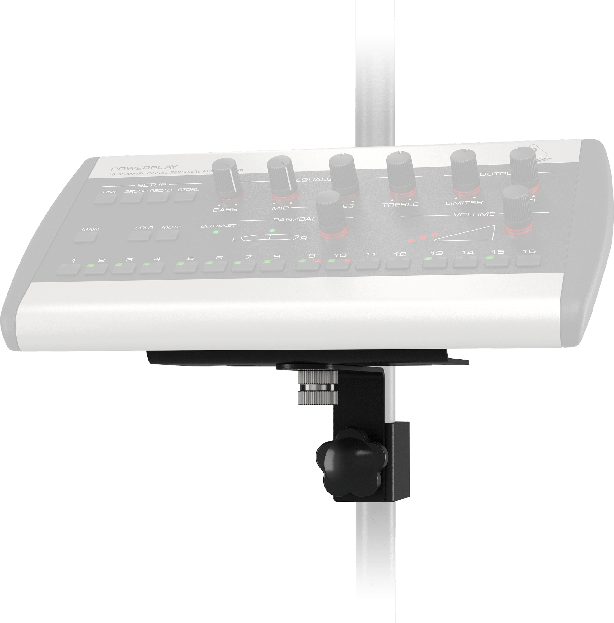 Facilita la instalación del mezclador personal P16‑M de Behringer con este soporte de montaje profesional: se adapta a trípodes de micrófono, atril o batería, con instalación rápida y segura, ideal para músicos en estudio o escenario.