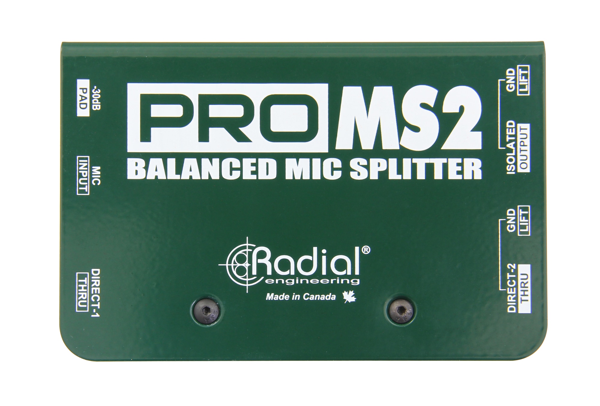 Radial ProMS2 es la interfaz perfecta para dividir un micrófono para alimentar más de un mezclador al mismo tiempo. El aislamiento del 100% elimina posibles bucles de tierra entre las dos consolas para un rendimiento silencioso, mientras que la salida principal proporciona una ruta de retorno de alimentación fantasma de 48 V al micrófono.