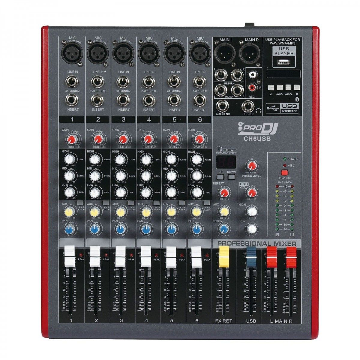 Realizar tus eventos nunca había sido tan fácil como lo será ahora con la mezcladora análoga CH6USB de 6 entradas híbridas (XLR o PLUG TRS 1/4); puedes reproducir música de forma sencilla a través de su puerto USB para reproducción MP3 o por enlace bluetooth, esto sumado a sus ecualizadores de 3 bandas y su procesador con 16 efectos predeterminados lo convierten en la primera opción para realizar tus eventos.